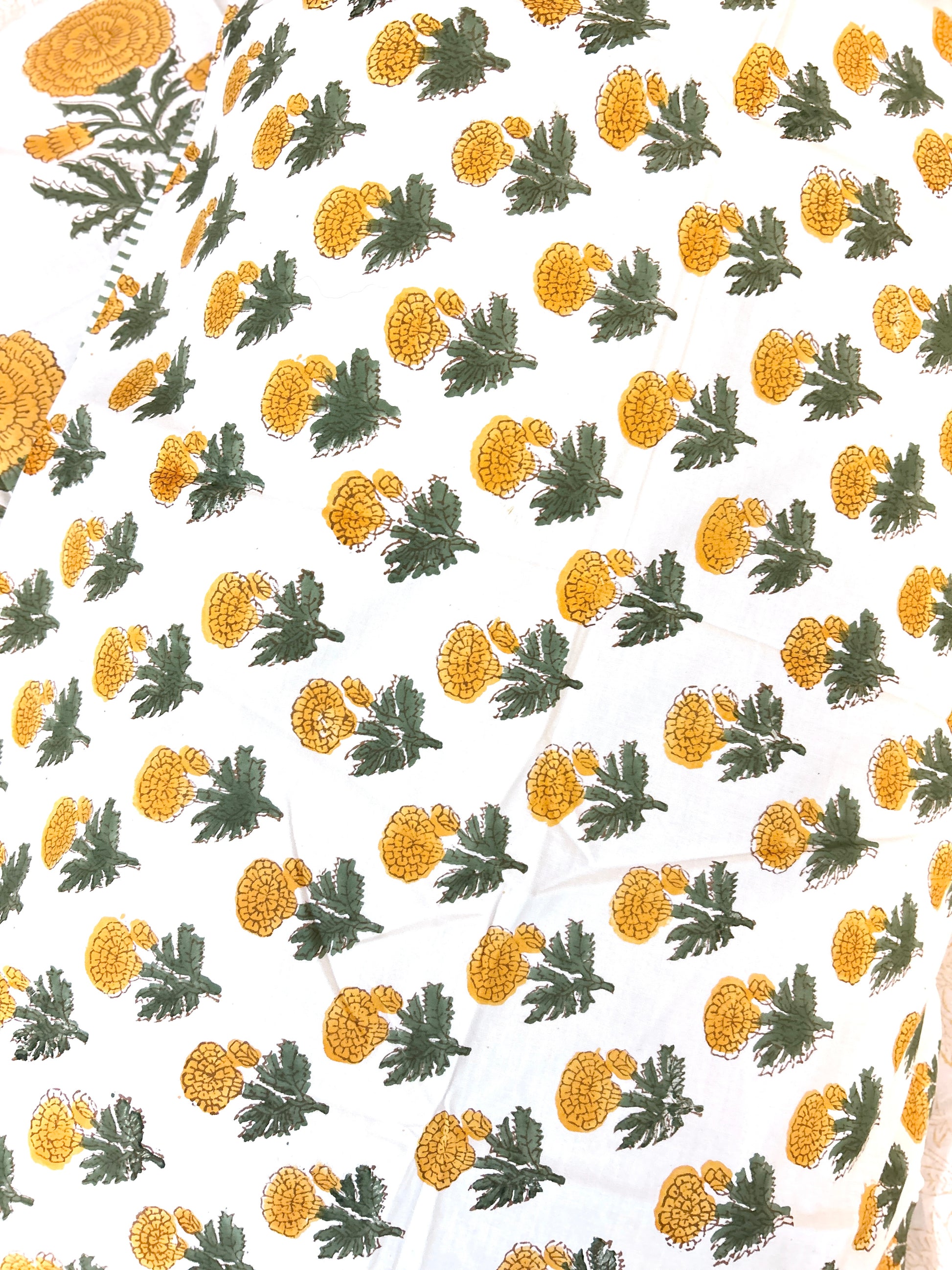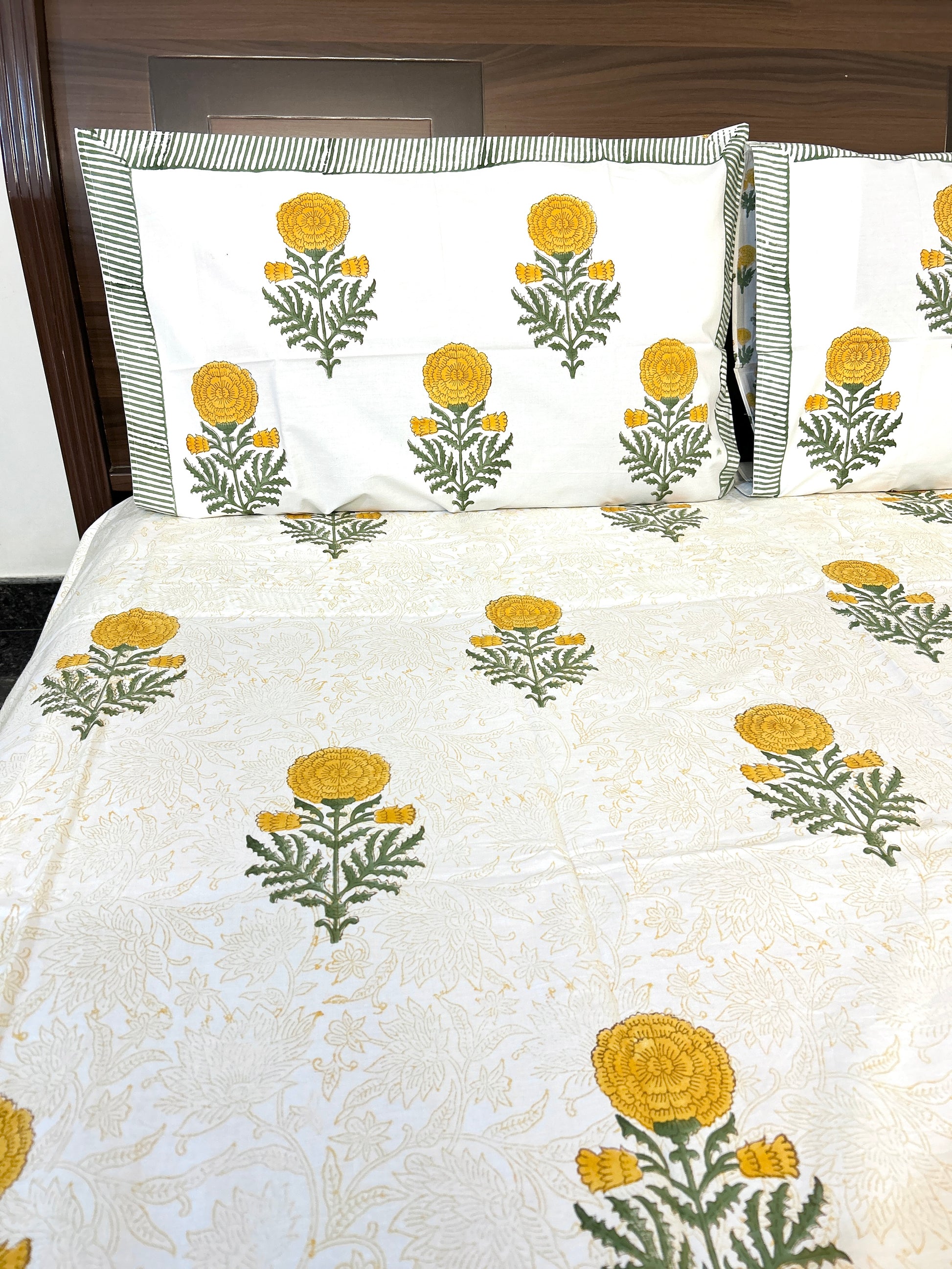Yellow Marigold Block Printed Cotton Bedsheet(90x108)