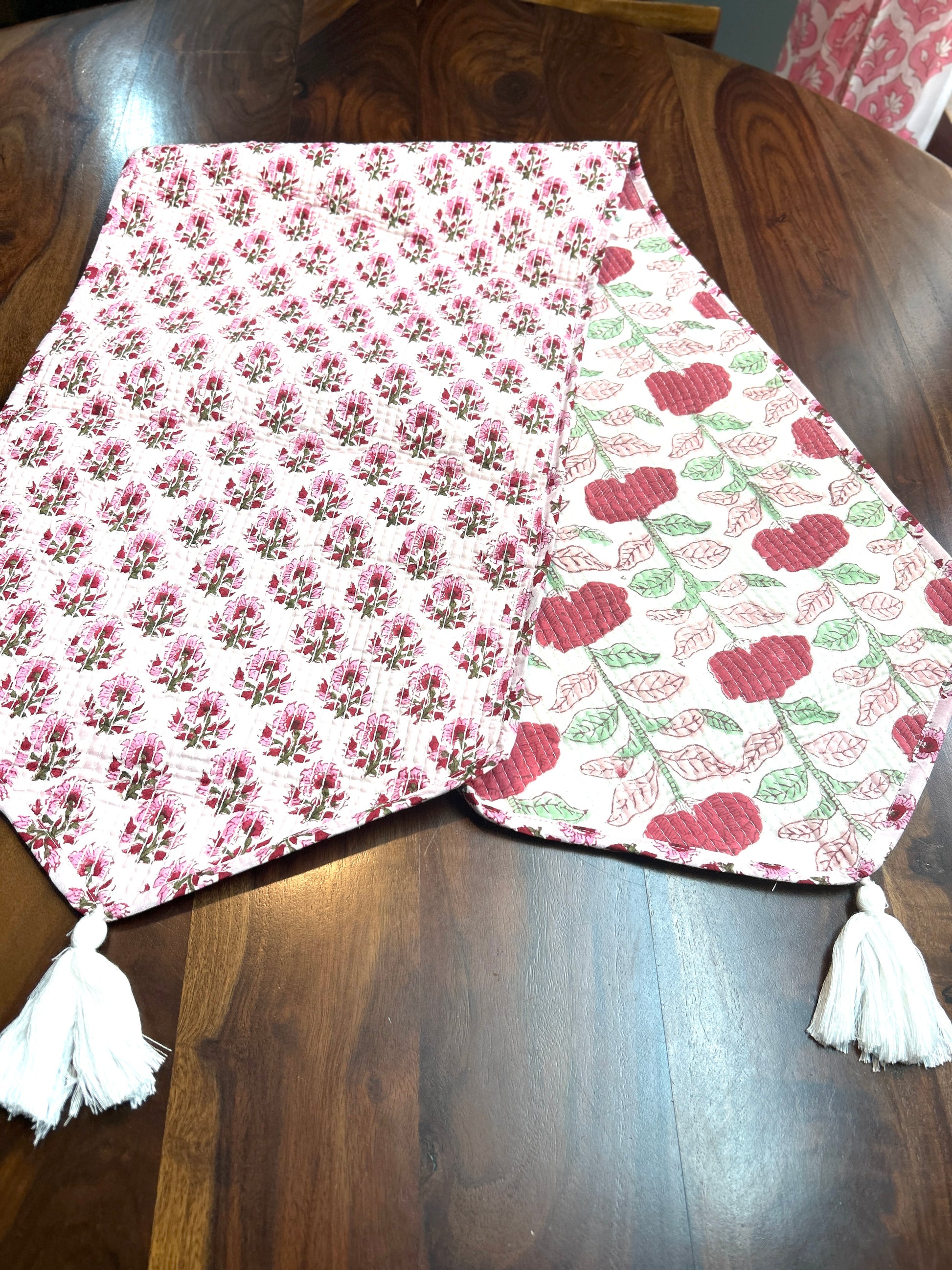 This Hand block printed table runner is quilted with beautiful tassels on both ends. These are also reversible allowing you to style in multiple ways.
